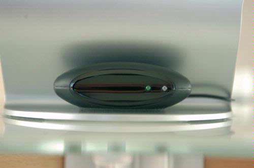 De IR-ontvanger vangt infraroodsignalen op van de afstandsbediening en moet dus in het zicht staan, net onder de tv bijvoorbeeld. We plaatsen ons table top-model op de voet van de tv, maar er bestaan ook ontvangertjes die je kan inwerken in de muur.