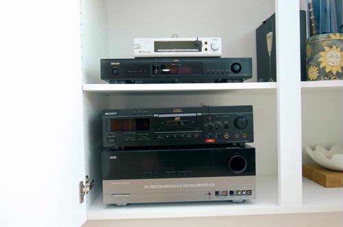 Technisch gezien is dat geen probleem, maar mooi is anders. Het ene zilver is het andere niet en ook de breedtes van de toestellen zijn niet altijd gelijk. Daarom zou je het stapeltje apparaten liefst in je nieuwe kast verstoppen. Dat kan wel, maar het schept problemen naar de bediening toe. En telkens het deurtje openzetten als je een streepje muziek wil horen of even het nieuws wil bekijken, dat werkt ook niet echt handig.