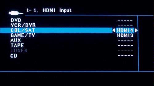 Roep het menu op en selecteer 1. Input Assign, 1. HDMI Input. Omdat we onze PS3 via HDMI-aansluiting 3 hebben aangesloten, wijzen we die ingang toe aan ‘GAME/TV’. Onze HD Digicorder hangt aan HDMI 4, dus die wijzen we toe aan ‘CBL/SAT’ (kabel- of satellietontvanger). Zet alle andere functies op blanco.