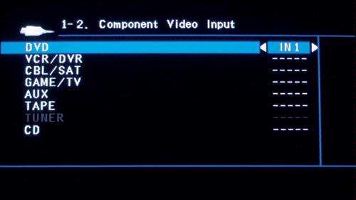 De volgende stap is onze dvd-speler toewijzen. Ga terug naar het hoofdmenu en selecteer 1. Input Assign, 2. Component Video Input. Onze oude dvd-speler is aangesloten op IN 1, dus wijzen we die ingang toe aan ‘DVD’. Zet ook hier de andere functies op blanco.