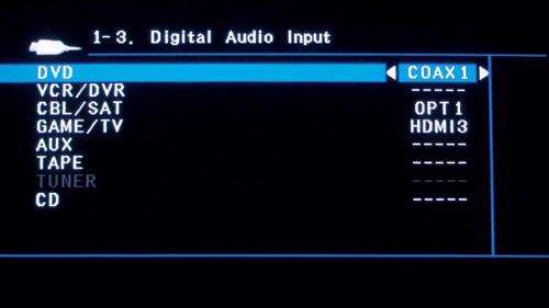 De laatste stap op onze av-receiver is het toewijzen van de audio-ingangen. Ga terug naar het hoofdmenu en selecteer 1. Input Assign, 3. Digital Audio Input. We kennen COAX 1 toe aan ‘DVD’, OPT 1 aan ‘CBL/SAT’ en HDMI 3 aan ‘GAME/TV’.