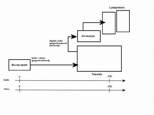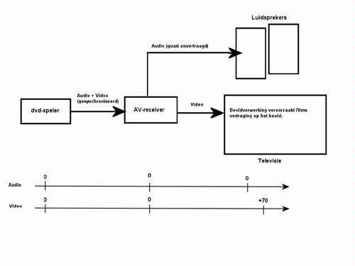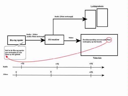 De bron, bijvoorbeeld een dvd-speler, wordt aangesloten op de av-receiver. Die behandelt het geluid quasi zonder vertraging, en stuurt het beeld door naar de televisie. De televisie bewerkt de beelden echter nog eens, en toont ze daardoor wel met een zekere vertraging. Hoeveel vertraging hangt van de televisie af, maar het kan duidelijk zichtbaar zijn.