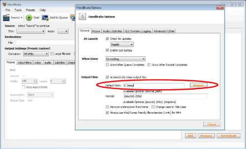 Na de installatie van Handbrake hoef je in de opties maar één ding aan te passen. Klik in het menu Tools op Options en selecteer de General-tab. In de sectie Output Files bepaal je dan het pad (‘Default Path’) waar de geconverteerde bestanden terechtkomen.