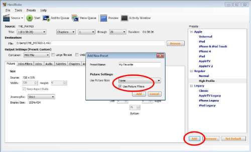 Omdat de crop- en resize-keuzes meestal per film verschillen, laat je Use Picture Size best op None staan. Vink Use Picture Filters aan als je ook je keuze uit stap 6 wil bewaren.