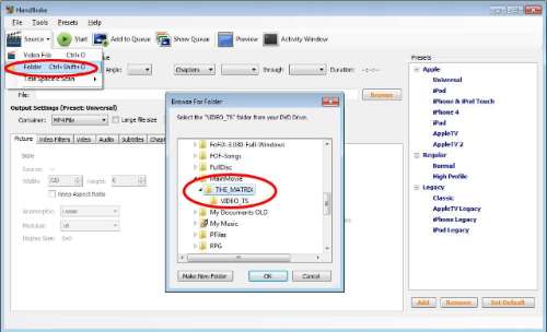 Ga op zoek naar de map waarnaar je de dvd geript hebt in de vorige aflevering van deze workshopreeks en duidt de VIDEO_TS-map aan of de map daar net boven (in ons voorbeeld ‘THE_MATRIX’). Het programma leest de dvd-structuur en selecteert de hoofdfilm.