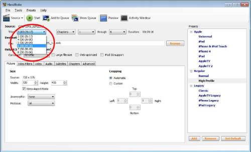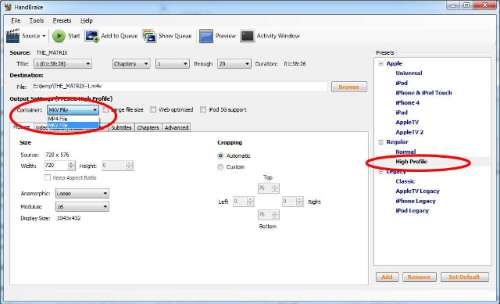 Encodeer je voor een specifiek Apple-toestel, dan kan je rechts een van de corresponderende ‘presets’ kiezen. Die passen alle nodige instellingen dan aan. Voor andere spelers kies je best voor Normal of High Profile.