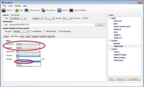 In de tab Video Filters bepaal je hoe Handbrake interlaced bronnen (zoals een dvd) behandelt. De High Profile-preset gebruikt de standaard Detelecine– (om schokkende panbeelden te vermijden) en Decombfilters (om eventuele kameffecten te bekampen).