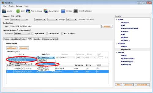De High Profile-preset gebruikt standaard een AC3-spoor (Dolby Digital) en een AAC-stereoversie van hetzelfde geluidsspoor voor maximale compatibiliteit. We geven er de voorkeur aan om enkel de originele Dolby Digital (AC3 Passthru) of DTS (DTS Passthru) te behouden.