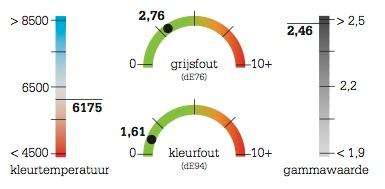 Ook het witpunt is identiek, maar de gammacurve gebruikt een waarde van 2,35. Dat zorgt voor iets donkerdere middentinten dan de gebruikelijke 2,2-waarde. We kozen bij de meeste tests voor ‘THX Cinema’-mode. Die levert een bijna perfect kleurbereik. De grijsschaal is lichtjes geel-oranje getint, maar dat is nauwelijks zichtbaar in de praktijk. Wel opmerkelijk is de vrij hoge gammawaarde. Die zorgt voor een benadrukt contrast en wat donkerdere middentinten, al mag dat voor een modus die bedoeld is om te kijken bij verduistering niet echt verrassen.