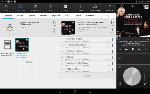 Door te vegen op het hoofdscherm schakel je snel tussen recente en favorieten albums, wat vooral leuk is als je vaak eigen bestanden beluistert. Je hoeft je trouwens geen zorgen te maken over de compatibiliteit van eigen muziekbestanden, want Raumfeld ondersteunt wel bijzonder veel formaten. Lossy formaten (MP3, Ogg, WMA en AAC) werken probleemloos, evenals lossless bestanden op cd-kwaliteit of hoger (WAV, FLAC en Apple Lossless). Ook onze hi-res FLAC- en ALAC-bestanden (tot 192 KHz en 24-bit) speelden probleemloos af. Qua muziekdiensten heb je twee keuzes: Napster en Spotify. In Duitsland is er ook de optie WiMP, maar die dienst met FLAC-streaming heeft zijn weg nog niet gevonden naar de Benelux. Hopelijk komt daar snel verandering in! Net zoals vele anderen, is Spotify bij Raumfeld via de Connect-functie geïntegreerd. Dat wil zeggen dat de Raumfeld-speakers rechtstreeks vanuit de Spotify-app te bedienen zijn – maar ook dat je Spotify-streams niet gelijktijdig in meerdere kamers kan afspelen.