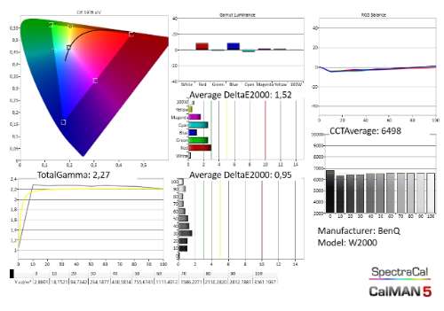 Het gebeurt niet vaak dat we een projector aanzetten en al van bij de eerste beelden spontaan denken: “Wow, dat ziet er erg mooi uit”. Vooral omdat kleurfouten meestal erg subtiel zijn, kijken we in veel gevallen toch wat langer en naar een divers aanbod beelden om een inschatting te maken. Maar de BenQ maakte een fantastische eerste indruk. Het toestel staat in de Cinema (Rec709) beeldmode, en dat levert rijke, maar natuurlijke kleuren, en fantastische goede weergave van de huidstinten. Als we de kleurmeter er bij halen, blijkt onmiddellijk dat de ‘CinematicColor’ badge op de behuizing geen versiering is. De BenQ is nagenoeg foutloos gekalibreerd. Bravo, zeker voor een projector in deze prijsklasse.