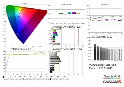 Het kleurbereik van de UE55KU6400 is zeer goed, maar de grijsschaal is niet perfect neutraal. In de donkere tinten is ze wat te koel en in de lichte tinten overweegt een zachte groene toon. In de meeste beelden zal je dat nauwelijks of niet merken, enkel in duidelijk witte scenes kan de lichtgroene tint wel zichtbaar zijn.