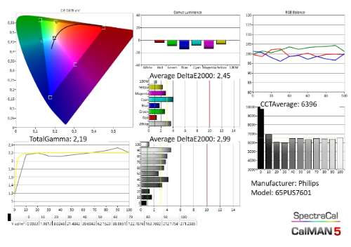 Middenklassers hebben over het algemeen maar een matige reputatie als het over HDR-weergave gaat. Maar met zijn direct led-achtergrondverlichting met lokale dimming lijkt de PUS7601 alvast een belangrijke troef in handen te hebben. Maar na enkele testen is het duidelijk dat de Philips niet aan de andere vereisten van HDR kan voldoen. Met een maximale piekhelderheid van 473 nits en 356 nits bij een volledig wit scherm haalt hij wel behoorlijk heldere beelden, maar dat blijft strikt middenklasse terrein voor HDR. Voor een conventionele televisie is het dan weer erg goed. De achilleshiel van deze tv is echter het kleurbereik, dat met 79% van het DCI-kleurpalet nauwelijks een ‘uitgebreid kleurbereik’ kan claimen. Het eindresultaat is een soort van kruising tussen HDR en SDR. Dankzij het goede contrast en een voor een conventionele televisie erg hoge lichtopbrengst haal je nog duidelijk voordeel uit HDR. Maar het beeld verliest toch heel wat impact door het kleine kleurbereik.