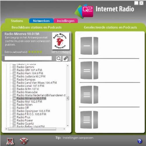 De set-up procedure is kinderlijk eenvoudig: je sluit de kleine kubus aan op je computer via de USB-poort op de achterzijde van de Q2, en sleept in het programma vier internetradiostations (of podcasts) uit de lijst naar de vier vakjes in de rechterzijde van het scherm. Die vier stations legt de Q2 dan vast in z'n geheugen.