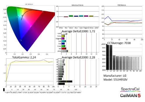 De metingen bevestigen onze eerste indrukken, het contrast op deze set is erg matig. Met de lokale dimming uit halen we nauwelijks 750:1 en met lokale dimming geactiveerd stijgt dat naar 1.500:1 wat nog steeds erg bescheiden is. De set toont prima zwartdetail, maar dat is vermoedelijk ten dele te wijten aan de povere zwartwaarde, waardoor donker detail makkelijker zichtbaar is. De kalibratie van de set is wel uitstekend. De grijsschaal is prima, en vertoont enkel een lichte groene schijn rond 20% wit. Wanneer je lokale dimming activeert verdwijnt dat effect grotendeels. Waar de LG absoluut geweldig op scoort is kleurweergave. Die zijn over het volledige spectrum erg nauwkeurig. Huidskleuren, zachte tinten, maar ook de felle schakeringen van kleuren op het voetbalveld, alles ziet er prima uit. De LG Is dan ook op zijn opperbest als je hem goed verlichte content laat tonen, bijvoorbeeld sport, duidingsprogramma’s, soaps of kinderfilms.