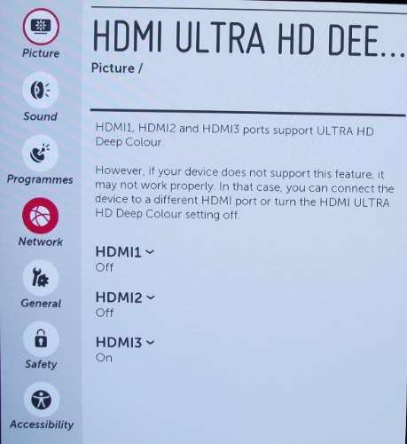 En opgelet, erg belangrijk: je moet ook in de televisie een instelling aanpassen, namelijk de manier waarop de HDMI-aansluiting zich gedraagt. Op een Samsung tv is dat de ‘HDMI UHD Color’ instelling. Op een LG tv is dat ‘HDMI Ultra HD Deep Colour’. In beide gevallen kan je per HDMI-aansluiting bepalen of die instelling aan of uit staat, voor je UHD Blu-ray-speler moet je ze aan zetten.
