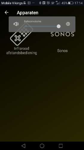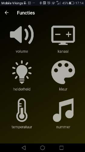 Stap 4: Kies het toestel. Hier stelt de app voor om ofwel het commando van een infrarood afstandsbediening te gebruiken, of in sommige gevallen toont hij ook toestellen. Zo kan je bij ‘volume’ ook rechtstreeks een Sonos toestel bedienen. En bij ‘Helderheid’ of ‘Kleur’ kan je Philips Hue, of LifX lampen kiezen.